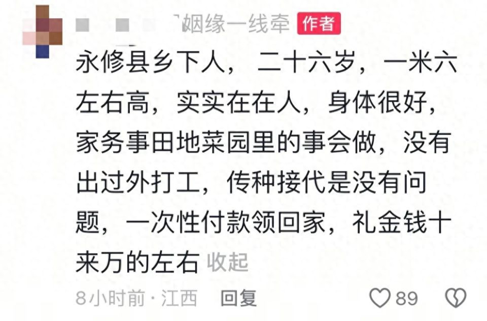 记者注意到,该网民发布了一张女性照片。图片配文提到,“永修县乡下人,二十六岁,一米六左右高,实实在在人,身体很好,家务事田地菜园里的事会做,没有出过外打工,传种接代是没有问题,一次性付款领回家,礼金钱十万左右。”