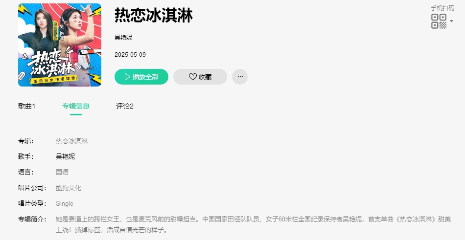 在音乐平台的吴艳妮个人专辑简介中这样写到:她是赛道上的跨栏女王,也是麦克风前的甜嗓担当。中国国家田径队队员、女子60米栏全国纪录保持者吴艳妮,首支单曲《热恋冰淇淋》甜美上线。撕掉标签,活成自信光芒的样子。