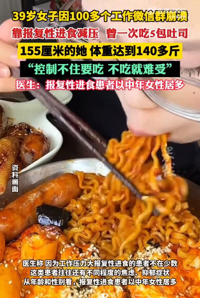医生称,因为工作压力大报复性进食的患者不在少数,这类患者往往还有不同程度的焦虑、抑郁症状。从年龄和性别看,报复性进食患者以中年女性居多。