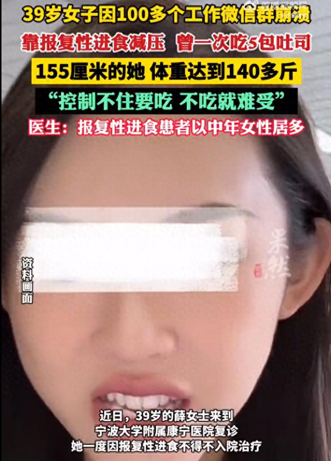 “我就是控制不住要吃东西,不吃就难受。我有100多个工作微信群,随时随地有未读消息要回复,感觉要被‘逼疯’了。而且,很多客户都是在下班后联系,弄得我也没有上下班时间。单单回复群消息,就能把我掏空。”