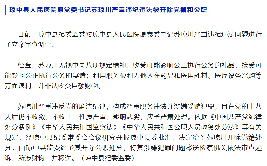 日前,琼中县纪委监委对琼中县人民医院原党委书记苏琼川严重违纪违法问题进行了立案审查调查。