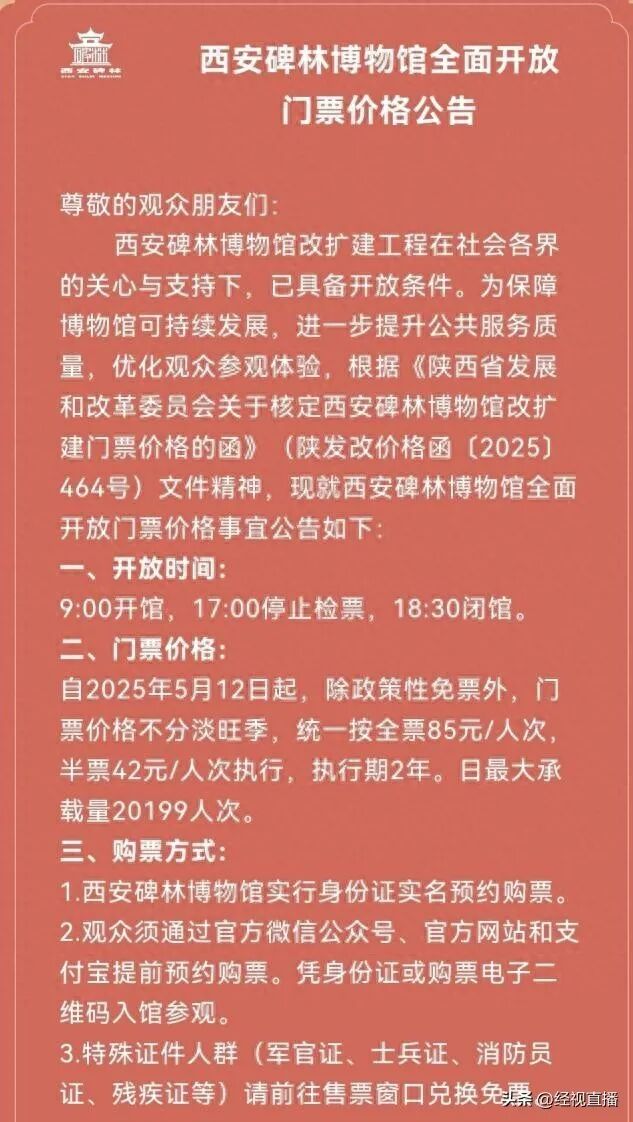 图/来源西安碑林博物馆官微据了解,西安碑林博物馆是首批国家一级博物馆,也是众多游客来西安的必打卡之地。此次门票价格从10元/人次调整为85元/人次,引发了不少人对价格上调的不解。5月9日,经视直播记者以游客身份致电西安碑林博物馆。工作人员介绍,当前10元/人次的票价是博物馆改扩建期间的“惠民票”,此次调整并非单纯涨价。此前65元/人次的票价只是“旧馆区”价格,5月12日起执行的85元/人次票价对应的是扩建后的“完整馆区”。工作人员进一步说明,西安碑林博物馆属遗址类博物馆,一直对外收费,此次价格调整是依据《陕西省发展和改革委员会关于核定西安碑林博物馆改扩建门票价格的函》(陕发改价格函〔2025〕464号)文件制定。陕西省文物局博物馆处工作人员也证实,西安碑林博物馆的门票价格通过了省发改委审批核定。同时,工作人员表示,此次调价是因为博物馆增加了一个大型新馆,且馆内碑刻布局有调整,像颜真卿等大家的碑刻展示有所变化。据了解,西安碑林博物馆改扩建工程建成后,展陈面积较原来增加三倍,文物展品增至1400余件组。新馆开放后,观众将有机会欣赏到更多珍贵文物和名碑。