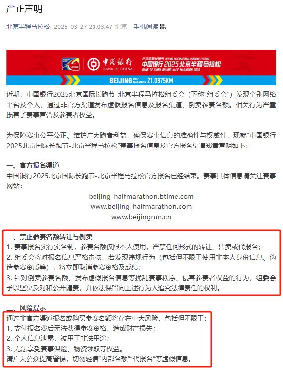 图为2025年北京半程马拉松声明。目前多地马拉松强调禁止名额转让、售卖或代报名,并提示非官方渠道存在虚假报名风险。