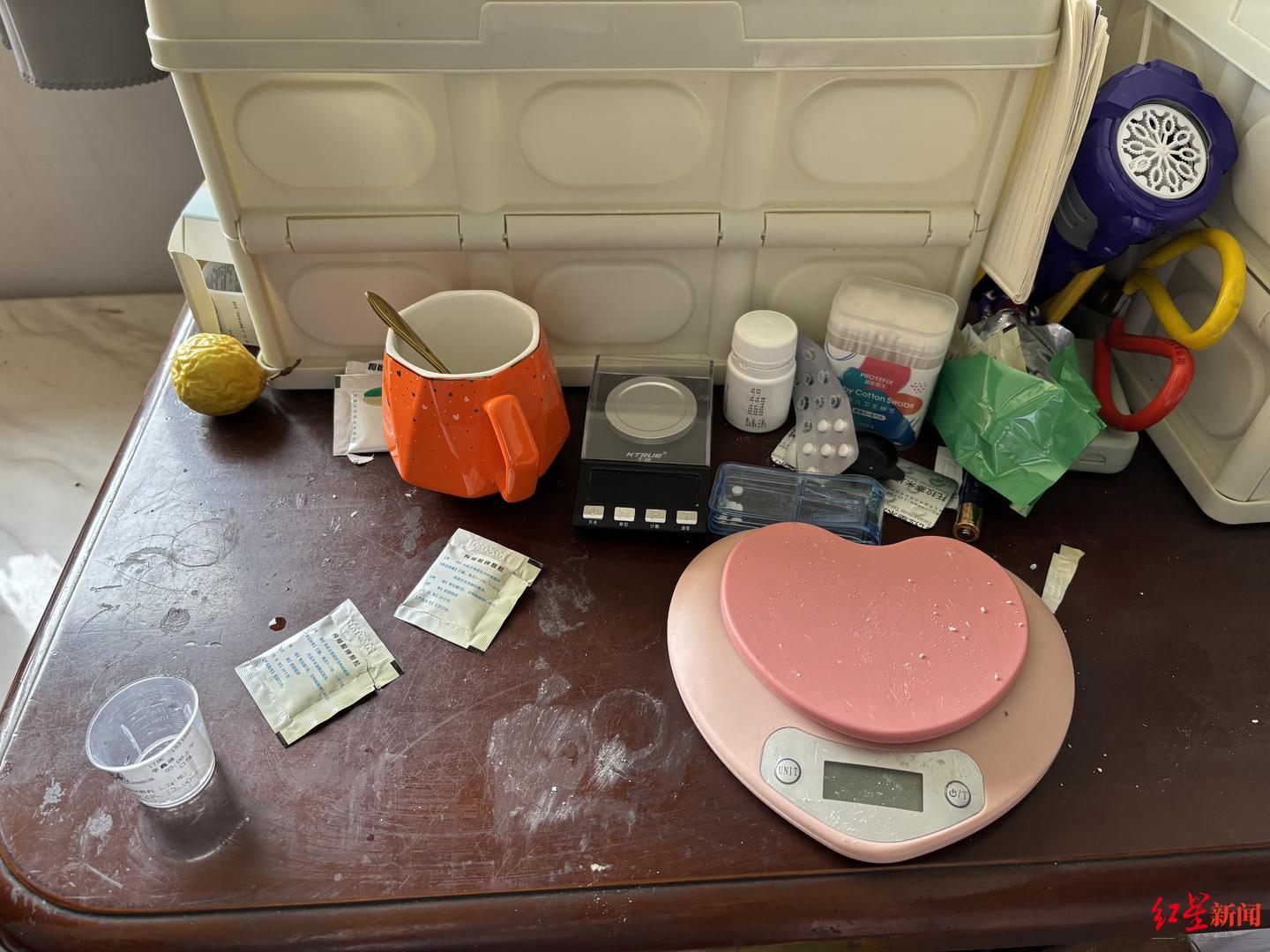 客厅角落的简易货架上摆满林静带货的零食样品。墙上贴着某品牌的背景墙纸,靠窗的位置堆着十多箱样品鞋——昨天,这里被布置成专场直播间,林静播到晚上11点多。客厅另一个角落里放着淼淼的药:枸橼酸钾颗粒、托拉塞米片……林静告诉红星新闻记者,目前淼淼一个月的药费大约是2000元。