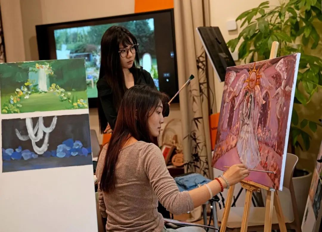 上海徐汇区淮海中路的一间国风手作小店,画师在小店举办的“婚礼绘画师”主题活动中现场作画交流(新华社4月26日摄)。