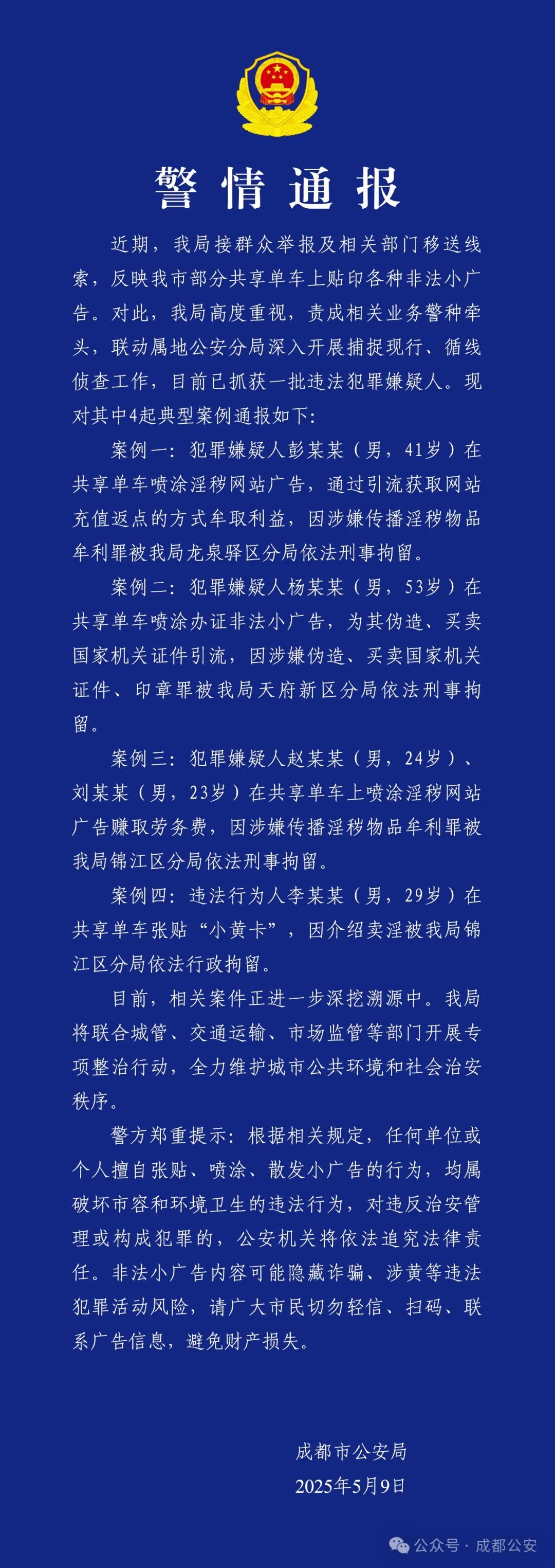近期,我局接群众举报及相关部门移送线索,反映我市部分共享单车上贴印各种非法小广告。对此,我局高度重视,责成相关业务警种牵头,联动属地公安分局深入开展捕捉现行、循线侦查工作,目前已抓获一批违法犯罪嫌疑人。现对其中4起典型案例通报如下: