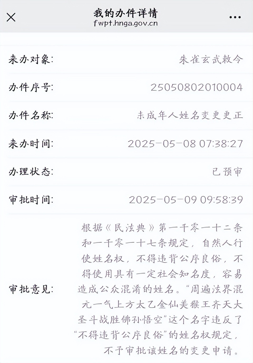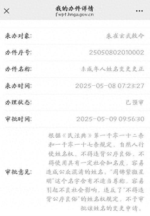 “这是我们湖南公安服务平台。”小朱提供了系统截图,记者看到,系统审批时间是5月9日上午,审批意见栏显示,根据《民法典》相关规定,自然人行使姓名权,不得违背公序良俗,不得使用具有一定社会知名度,容易造成公众混淆的行为。