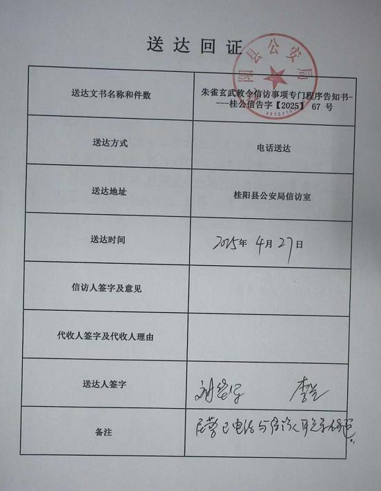 此外,一份盖有桂阳县公安局公章的送达回证显示,上面有送达人的签字,备注栏标明民警已电话与信访人联系。