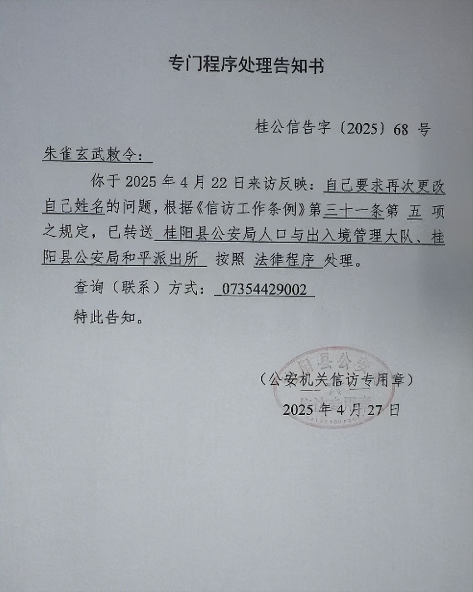 此前,一份盖有桂阳县公安局信访专用章的《专门程序处理告知书》显示,“朱雀玄武敕令”自己要求再次更改姓名,根据《信访工作条例》相关规定,已转送桂阳县公安局人口与出入境管理大队、桂阳县公安局和平派出所按照法律程序处理。