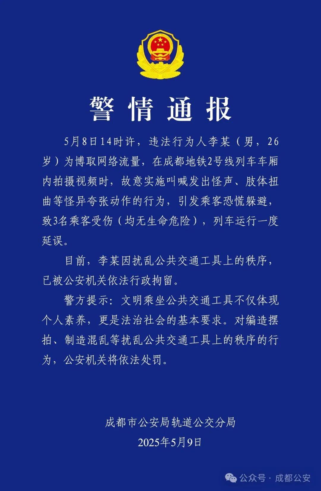 2025年5月9日,成都市公安局轨道公交分局发布警情通报: