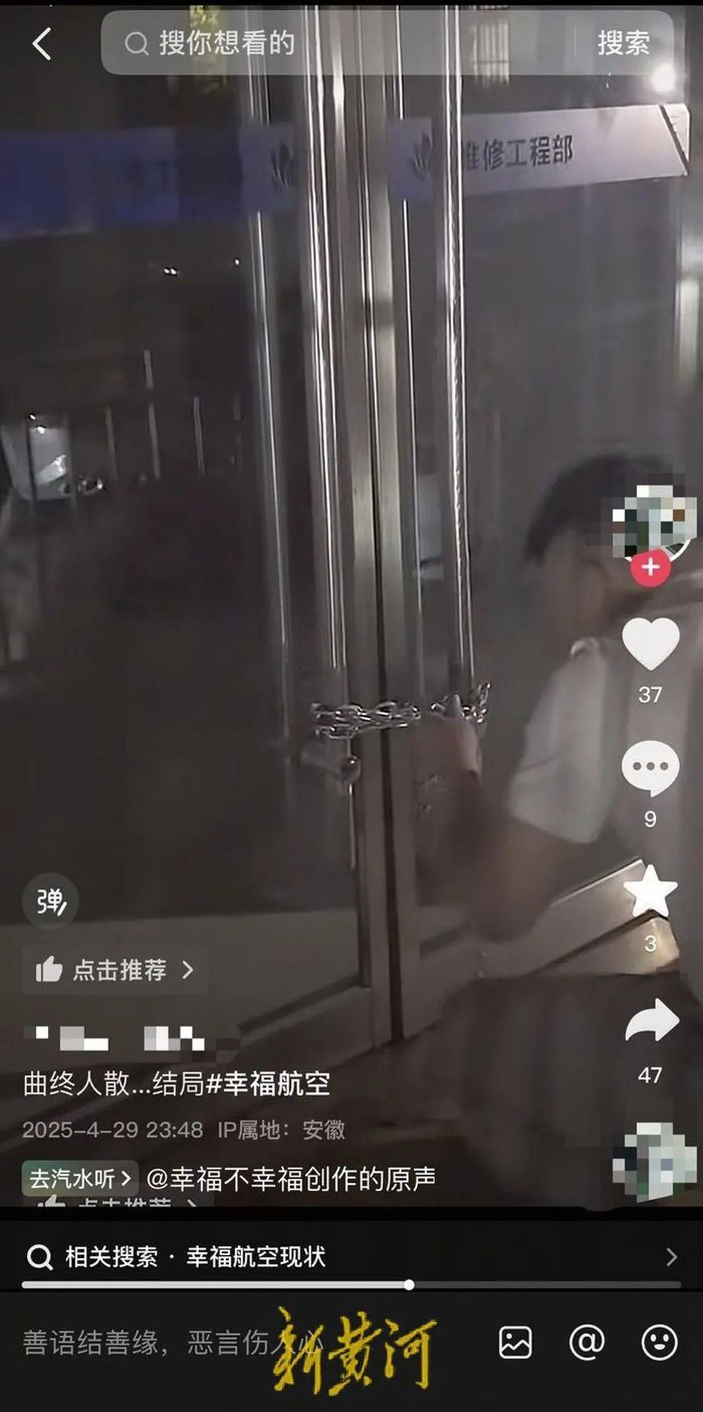 在社交平台上,还有不少自称幸福航空前员工的博主,谈到幸福航空时都会提及欠薪话题。一名前空乘人员说道,在职员工与离职员工均被欠薪、欠社保,对于“五一”后是否复航,她引用官方回应称“如果能飞,就会继续飞。”还有一名博主不仅晒出员工集体讨薪的画面,还在4月29日发布的一则“维修工程部”大门上锁的视频中配文“曲终人散……结局”。