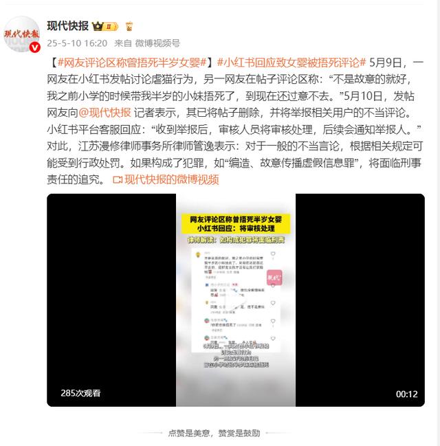 5月9日,一网友在小红书发帖讨论虐猫行为,另一网友在帖子评论区称:“不是故意的就好,我之前小学的时候带我半岁的小妹捂死了,到现在还过意不去。”