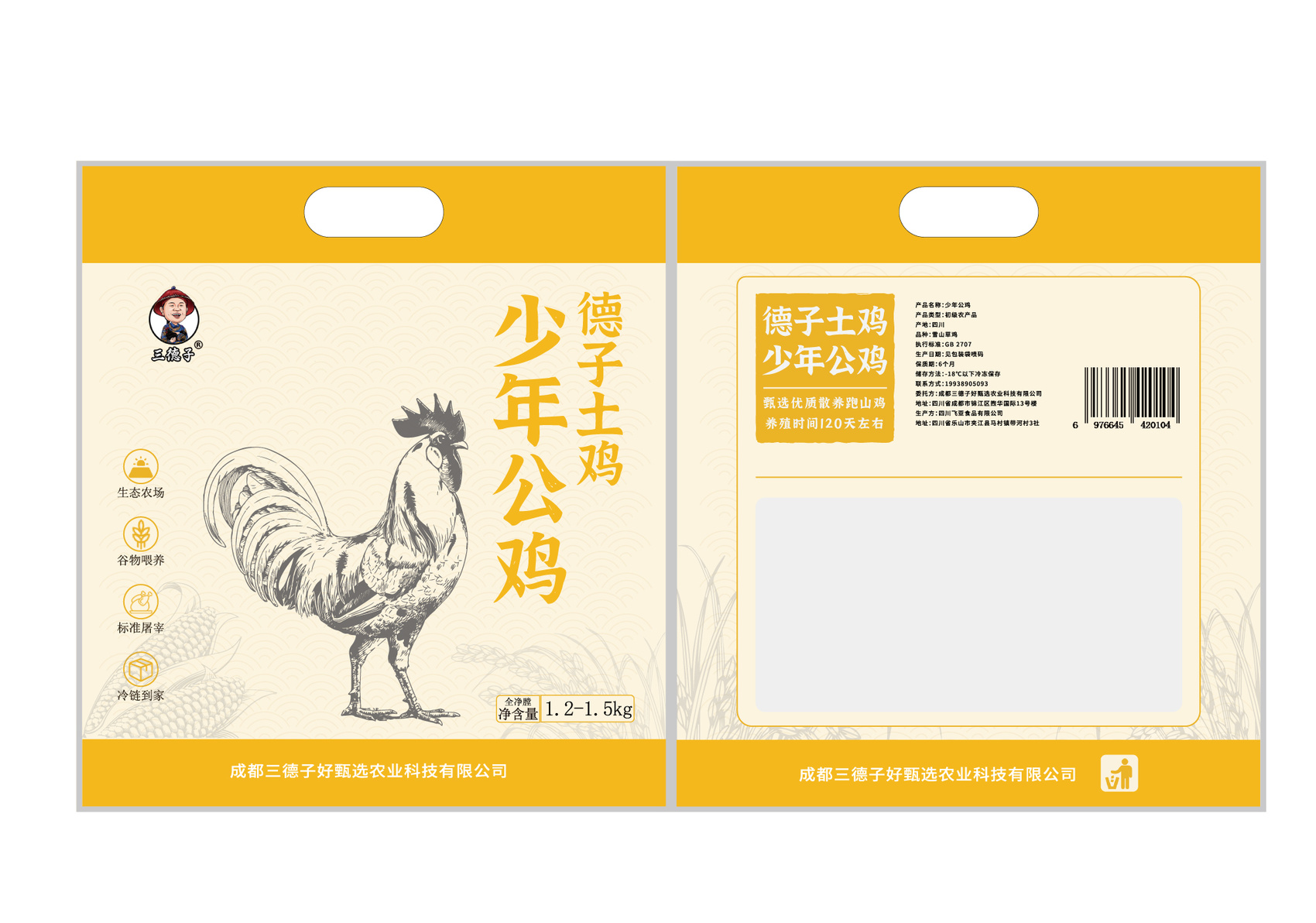 记者从涉事公司所销售产品包装袋上发现,使用的是“三德子”商标。但在“少年公鸡”或“青年公鸡”前面,均标注有“德子土鸡”字样。