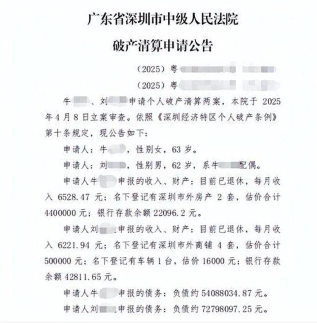 根据法院公告,牛某、刘某申请个人破产清算为两案,两个案件虽然合并公告,但使用不同的案号,深圳市中级人民法院于 2025年4月8日立案审查。