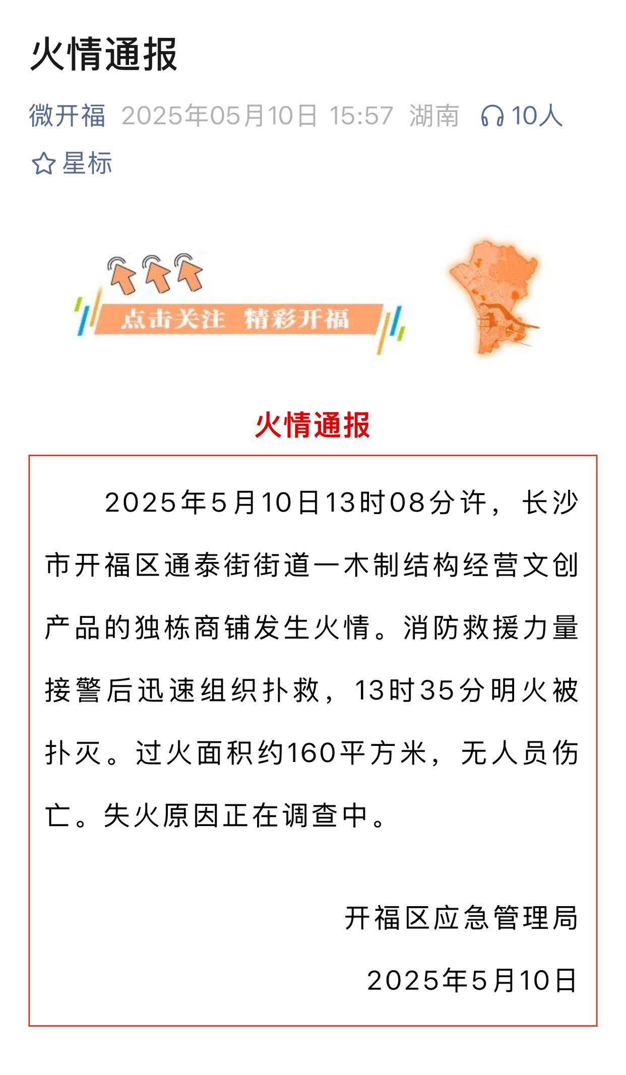 5月10日下午,长沙市开福区应急管理局发布火情通报称,当日13时08分许,长沙市开福区通泰街街道一木制结构经营文创产品的独栋商铺发生火情。消防救援力量接警后迅速组织扑救,13时35分明火被扑灭。过火面积约160平方米,无人员伤亡。失火原因正在调查中。