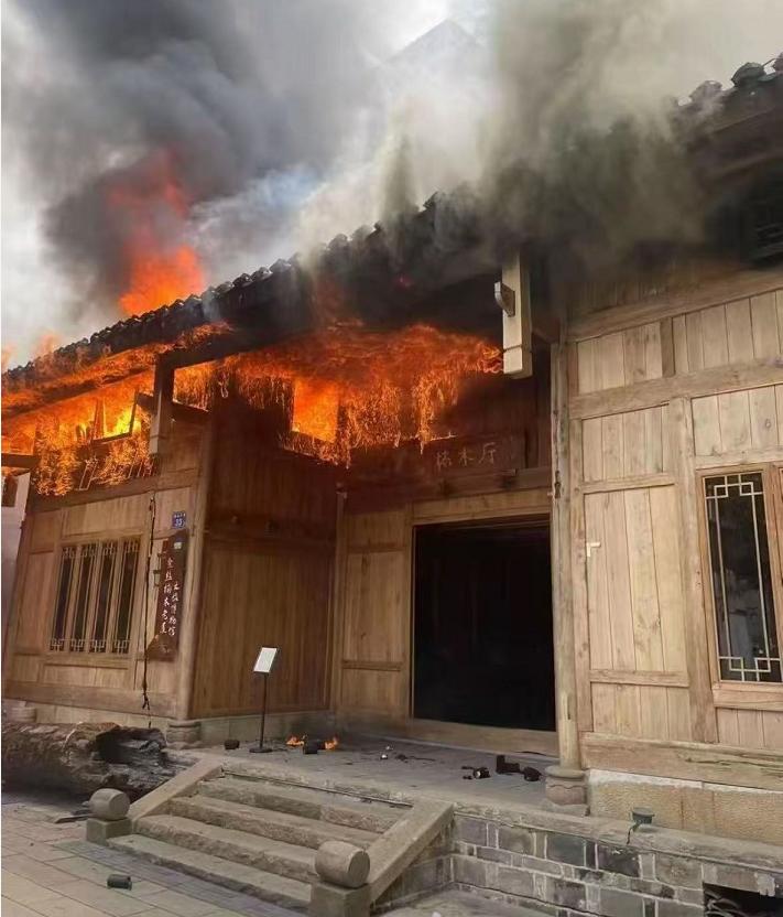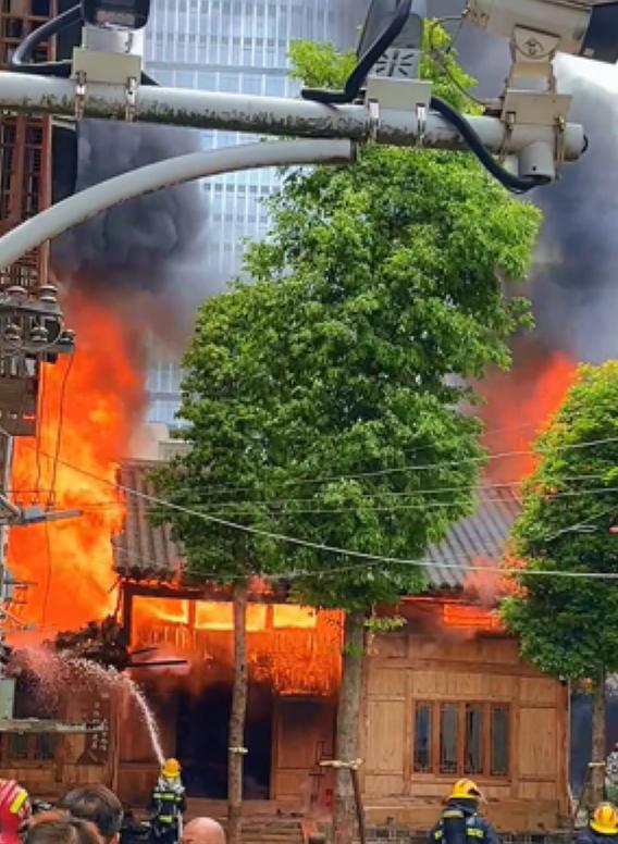 5月10日下午,湖南省长沙市开福区潮宗街金丝楠木展厅着火,里面陈设的文创品被付之一炬。