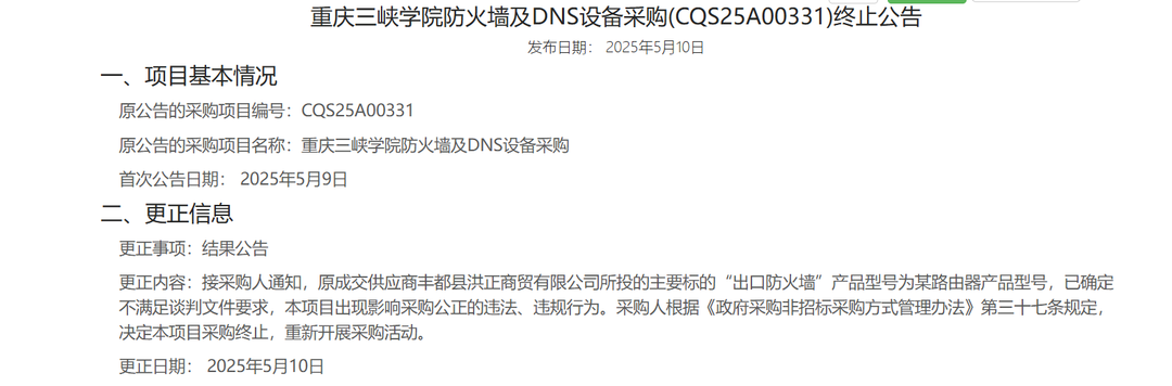 据5月10日发布的《重庆三峡学院防火墙及DNS设备采购(CQS25A0031)终止公告》显示,接采购人(重庆三峡学院)通知,原成交供应商丰都县洪正商贸有限公司所投的主要标的“出口防火墙”产品型号为某路由器产品型号,已确定不满足谈判文件要求,本项目出现影响采购公正的违法、违规行为。采购人根据《政府采购非招标采购方式管理办法》第三十七条规定,决定本项目采购终止,重新开展采购活动。