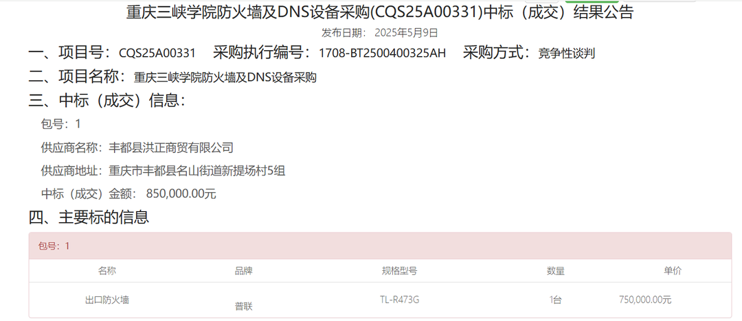 5月9日,该项目发布了设备采购中标结果公告。据中国政府采购网上发布的《重庆三峡学院防火墙及DNS设备采购(CQS25A00331)》中标结果显示,“丰都县洪正商贸有限公司”中标,中标金额为85万元。