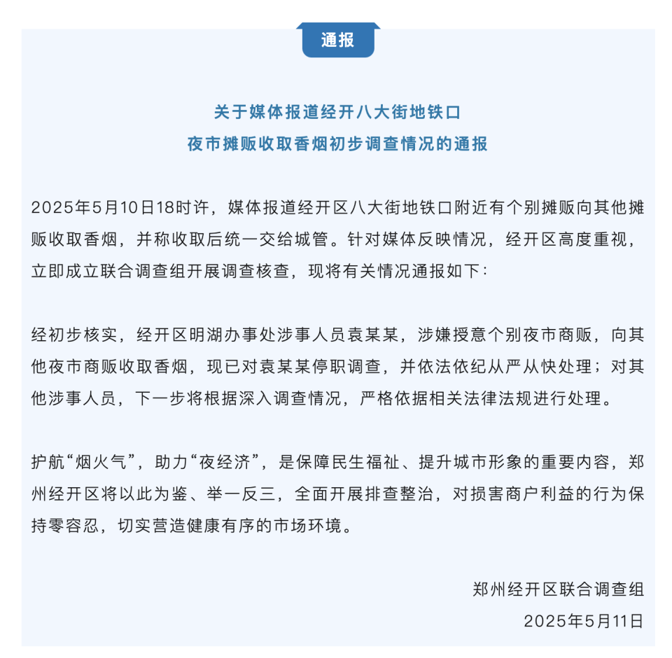 5月11日,郑州经开区联合调查组发布关于媒体报道经开八大街地铁口夜市摊贩收取香烟初步调查情况的通报: