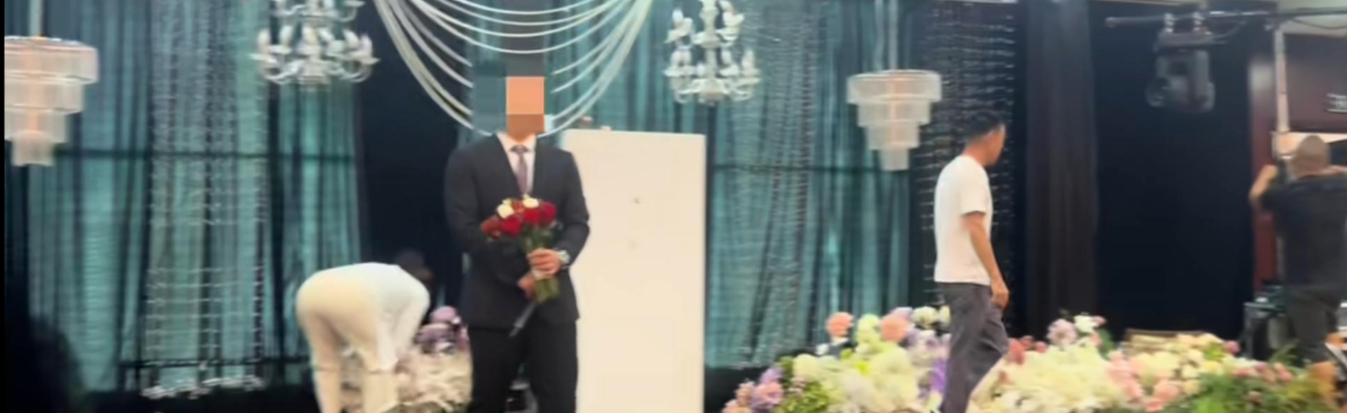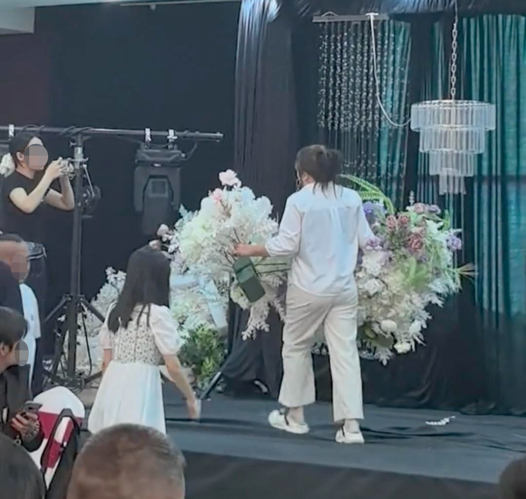 在叶某家属发布的视频中,婚庆公司的人员将花朵、展板等搬走,其中新人的一名亲属说:“现在是婚庆公司中途罢场,只有我们的新郎一个人在舞台上面,准备主持这场婚礼。”