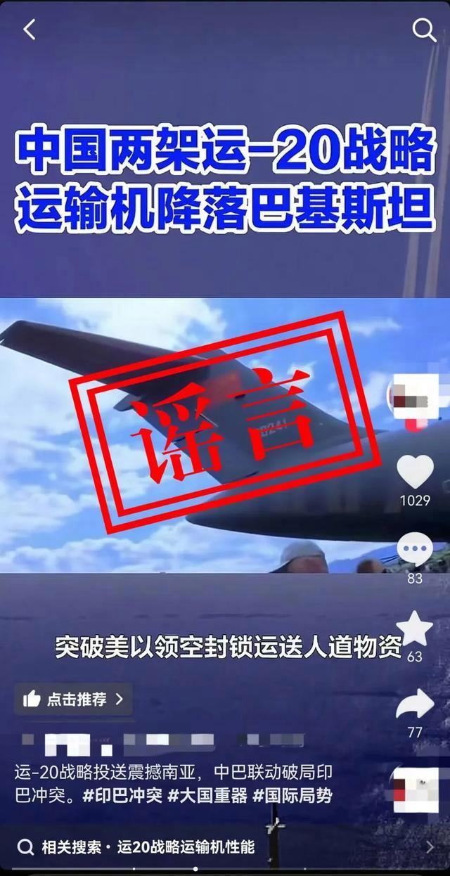 5月11日晚,“人民空军”微信公众号辟谣:近日,网络上出现大量关于“运-20向巴基斯坦运送救援物资”的消息。对此,人民空军表示,此消息为不实信息!网络不是法外之地!制作传播涉军谣言需负法律责任!