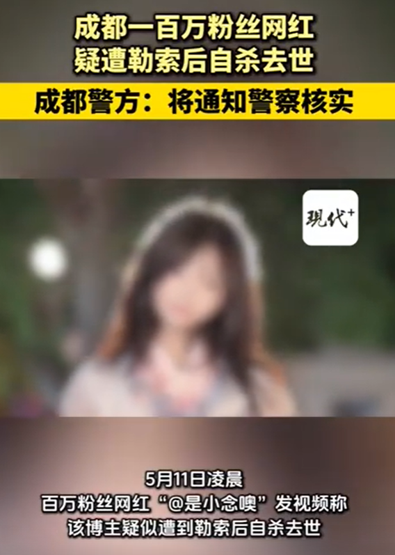 现代快报讯(记者 谢喜卓)5月11日凌晨,百万粉丝网红“@是小念噢”账号更新视频称,该博主疑似遭到勒索后自杀去世。5月12日上午,现代快报记者致电成都市公安局110报警中心,相关工作人员表示,会通知警察进行核实。