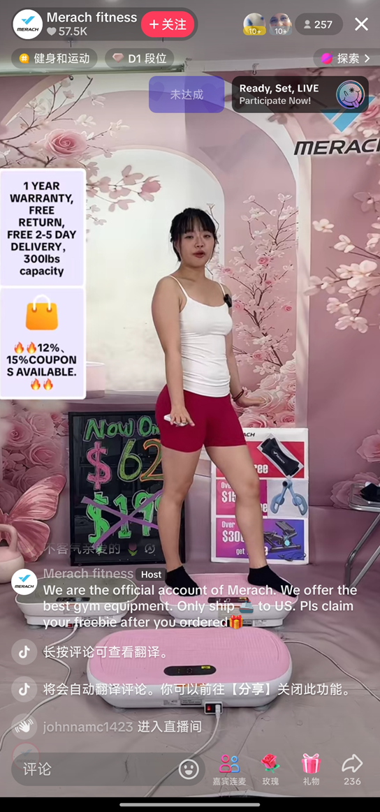 麦瑞克也同样大力投入TikTok Shop直播。麦瑞克直播间高度还原海外家庭健身场景,通过主播介绍、体验产品,实时与用户互动,在线解答问题,全方位服务网友。去年“黑五”期间,麦瑞克连续直播时长394小时,单场最高GMV超20万美元。