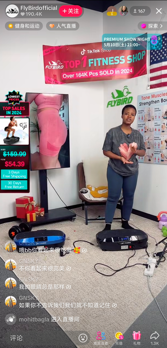 2024年“黑五”,飞尔总销售额430万美金,最高的一场自播在线人数高达数千人,GMV高达15万美金,3个自营直播间进入健身器械类目的前10。