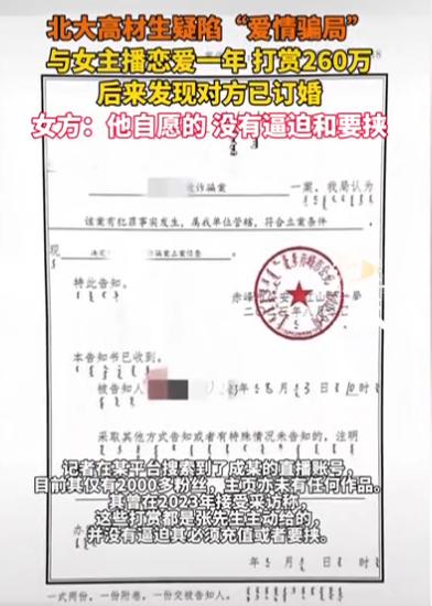 近日,一位北大高材生张成(化名)向记者反映,称他在2022年至2023年间与某平台女主播成某保持“网恋”关系,一年内通过直播打赏向其转账约260万元,后因发现对方已与他人订婚并拒绝见面而报案。