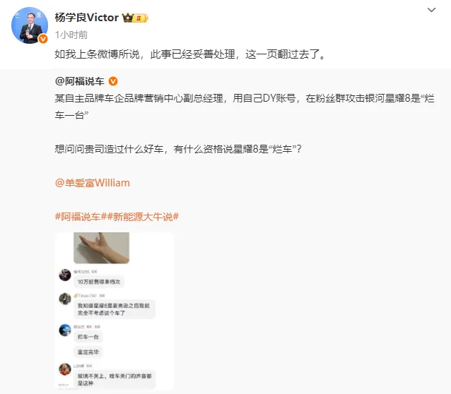 随后,杨学良转发称奇瑞这种规范管理和令行禁止值得我们学习,希望大家都引以为戒,严于律己,美美与共,发挥头部企业表率作用,推动中国汽车市场规范健康发展,用好技术好产品和好口碑为用户创造价值。