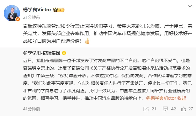 近日,我们奇瑞品牌一位干部发表了对友商产品的不当言论。这种言论很不妥当,也是奇瑞明令禁止的,违反了奇瑞公司《关于严格执行公开发言和媒体采访活动规范要求的通知》中第三条:“保持谦虚开放,不做拉踩对比。保持向友商、合作伙伴谦虚学习的态度。”我们对此事高度重视,立刻对相关责任人进行了严肃处理,停止其一切工作。我已和吉利的学良总进行了深度沟通,我们一致认为,中国车企应该共同维护行业健康清朗的氛围,相互学习、携手共进,推动中国汽车品牌的持续向上。