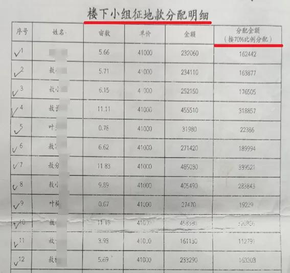 △公示的补偿明细显示村小组截留30%(当事人供图)