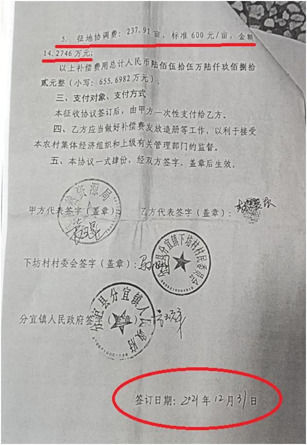 5月12日,分宜县县委宣传部的相关负责人给指尖新闻记者提供了一份《情况说明》,说明中写明:“2021年11月分宜县政府为了加快城市建设,改善城市配套基础设施,启动了钤东新城项目,分宜县自然资源局依法预征收了分宜镇下坊村楼下村小组土地575.547亩,签订了征收协议,全额支付了征地款。后续根据项目建设进展,再进行土地的报批及使用,没有使用到的土地村民依然可以使用,被征地里面没有基本农田。