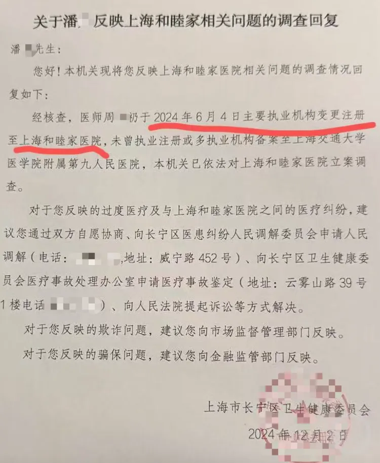 长宁区卫健委给潘先生的回复明确提到,周某礽并非上海交大医学院附属第九人民医院的医生。受访者供图