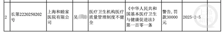2025年2月,潘先生在信用中国官网上查到了一份有关部门因自己的病例,对上海和睦家医院有限公司进行处罚的行政处罚决定书(长第2220250202号)。上游新闻记者在长宁区卫健委官网上也看到了这份行政处罚决定书。决定书显示,长宁区卫健委以违反《中华人民共和国基本医疗卫生与健康促进法》第一百零一条,医疗质量管理制度不健全为由,对上海和睦家医院有限公司处以警告、罚款30000元。