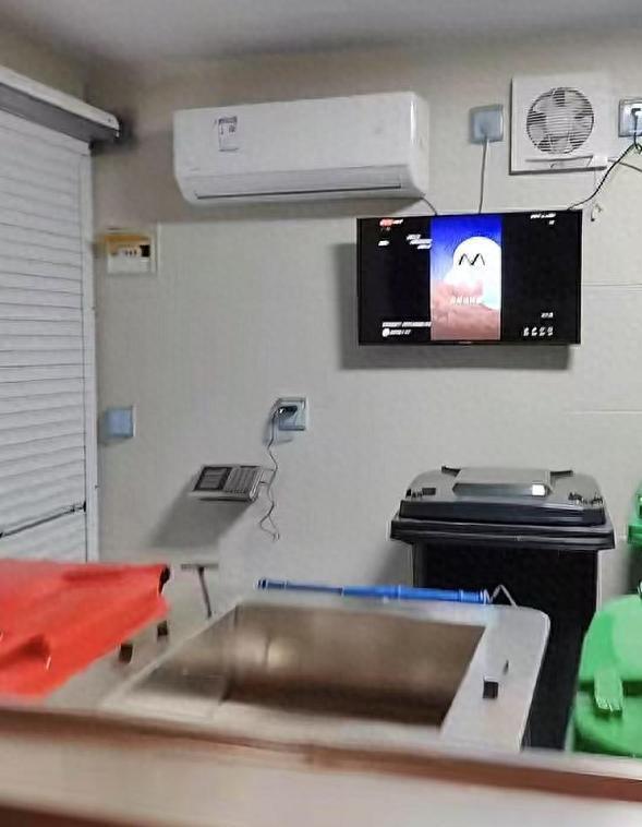 工作人员解释称:“空调是为了降温除臭呀,那其实也不是彩电,就是显示屏,也是为了播放一些垃圾分类的宣传片,是垃圾分类的督导员在里面值守。”