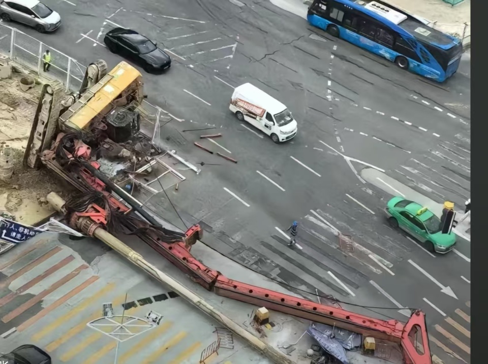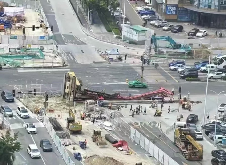 现场视频显示,事发地点位于珠海市人民路工地,时间约在上午10:45,当时不少车辆正在路口等待红灯。道路左侧约20米高的桩机突然侧翻倒下,随后砸向斑马线和一侧安全岛上的遮阳篷,打桩的机械臂带钻井杆横在马路上,机械臂折断处,疑似有带棚物体。有网友称,是否有人伤亡暂不确定。