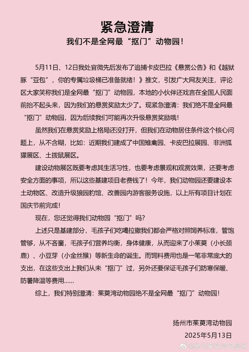 对此,5月13日,茱萸湾动物园发文澄清:5月11日、12日我处官微先后发布了追捕卡皮巴拉《悬赏公告》和《越狱豚“豆包”,你的专属垃圾桶已准备就绪!》推文,引发广大网友关注,评论区大家笑称我们是全网最“抠门”动物园,本地的小伙伴还戏言在全国人民面前抬不起头来,因为我们的悬赏奖励太少了。现紧急澄清:我们绝不是全网最“抠门”动物园,因为后续我们可能再次升级悬赏奖励哦!