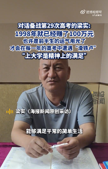 5月13日,据媒体报道,还有不到一个月就要高考了,四川“高考钉子户”58岁的梁实将参加他的第29次高考。