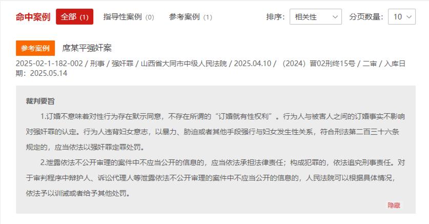 5月14日,根据人民法院案例库公开案例显示,山西大同“订婚强奸案”被列入最高人民法院发布的指导性案例或典型案例库。