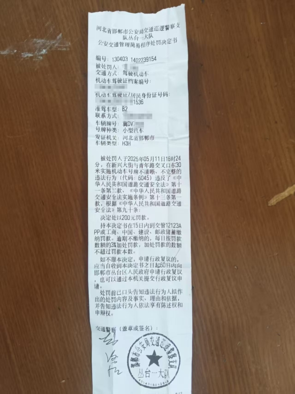 邯郸市公安局交通巡逻警察支队丛台一大队出具的处罚决定书显示,该车于5月11日16时24分,在新兴大街与青年路交叉口东30米处,因“机动车号牌不清晰、不完整”(违法代码:6045),违反《中华人民共和国道路交通安全法》第十一条第二款及《中华人民共和国道路交通安全法实施条例》第十三条第一款,被依法处以200元罚款。