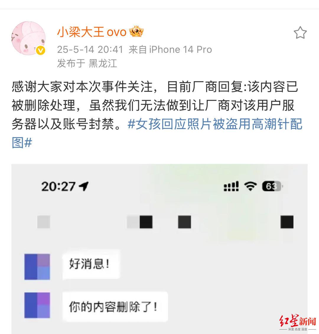 5月14日,梁女士告诉记者,她得知,色情网站上盗用自己图片的内容已被删除。她从朋友处确认,在色情网站检索“高潮针”已无相关内容。在微博上,她提及这一进展称“太高兴了”。