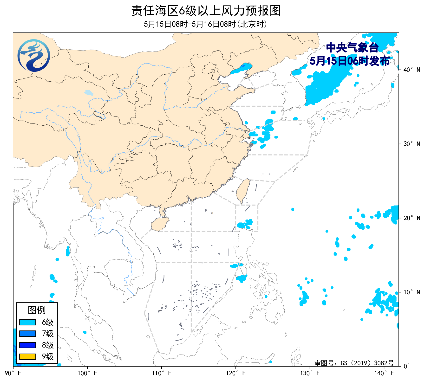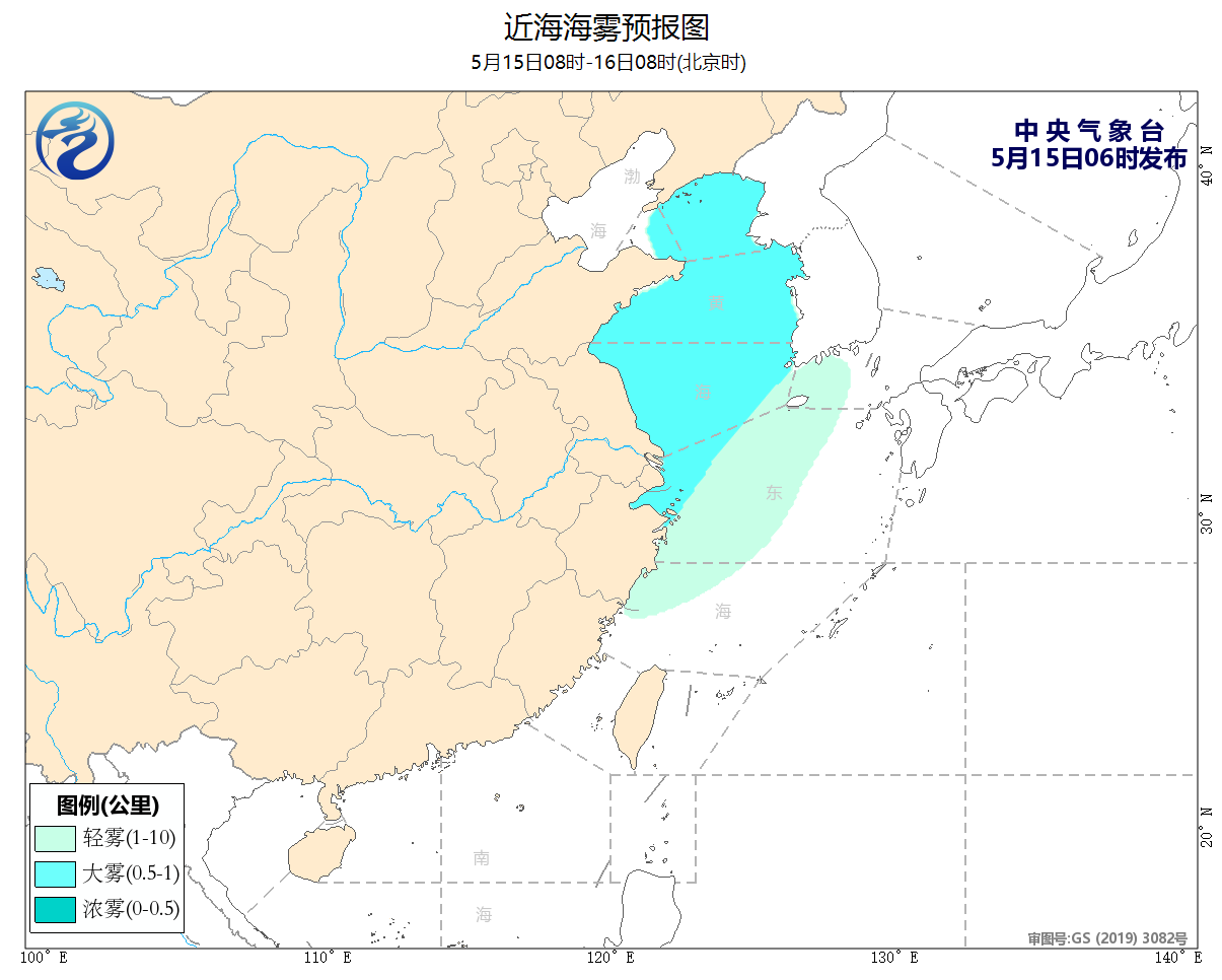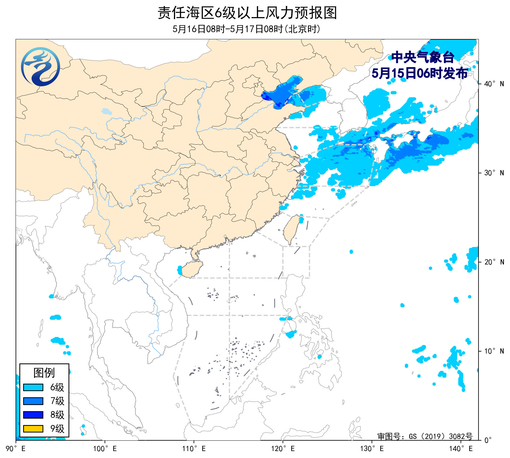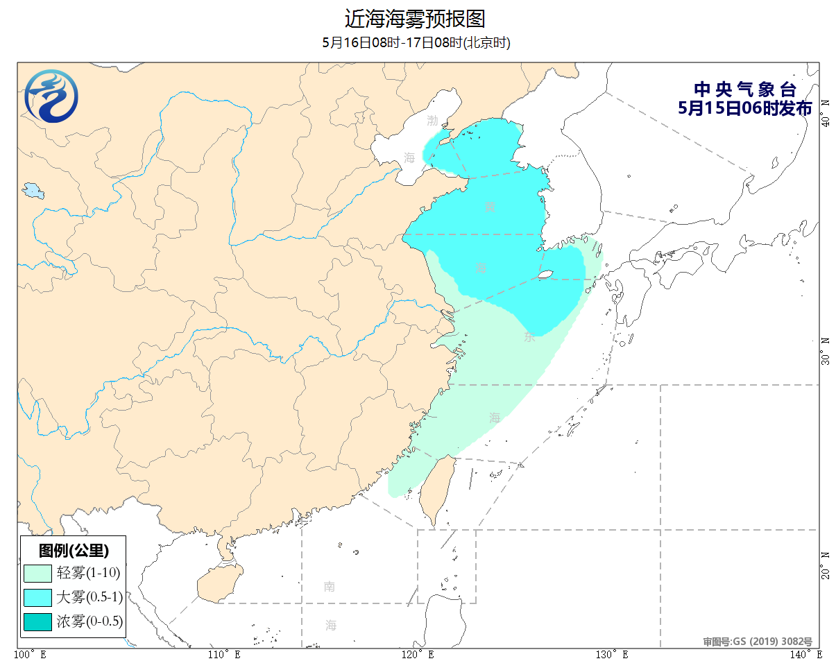 15日08时至16日08时,渤海将有4~6级、阵风7级的西南风到偏南风。渤海海峡、黄海大部海域、成山头附近海域、长江口及杭州湾附近海域、舟山群岛附近海域、上海港、宁波港将有能见度不足1公里的大雾。东海大部海域将有能见度不足10公里的轻雾。