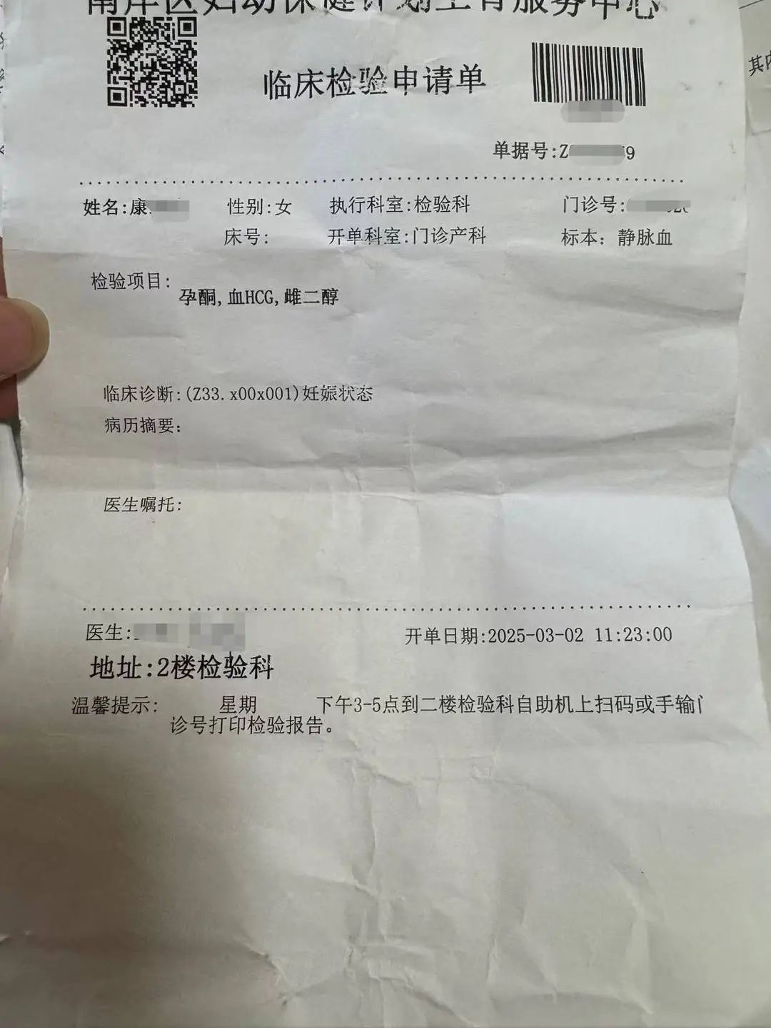 康女士还向记者展示了她的检查报告,来证明自己没有造假。相关临床检验申请单显示,康女士的检查项目包括孕酮、血HCG,雌二醇等,临床诊断为妊娠状态。