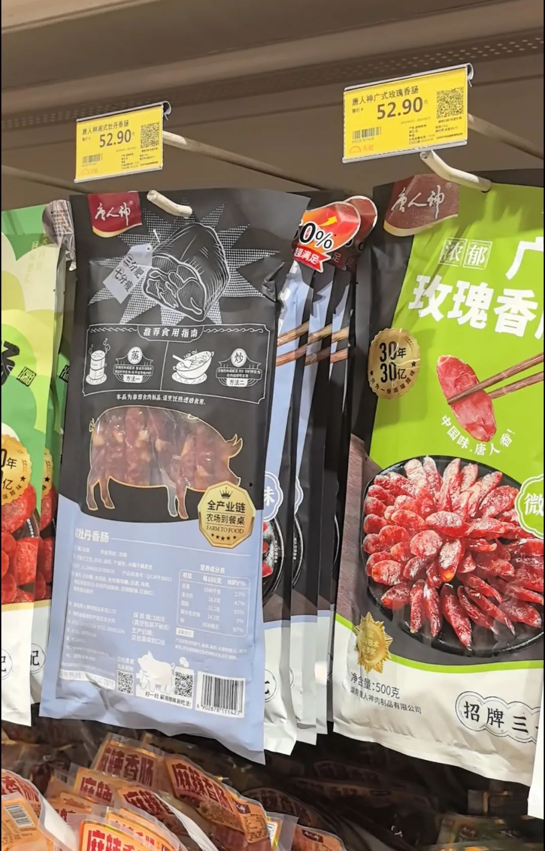 记者在超市内发现,唐人神系列的腊制品基本都采用了同款外包装。杨先生表示,“这个包装的问题,我们要去和供应商去协商,因为这不仅仅是在我们超市销售,是整个全国都在卖,包装设计的问题,我们只能建议他们能不能后面以后换成透明的包装,便于顾客去识别。”