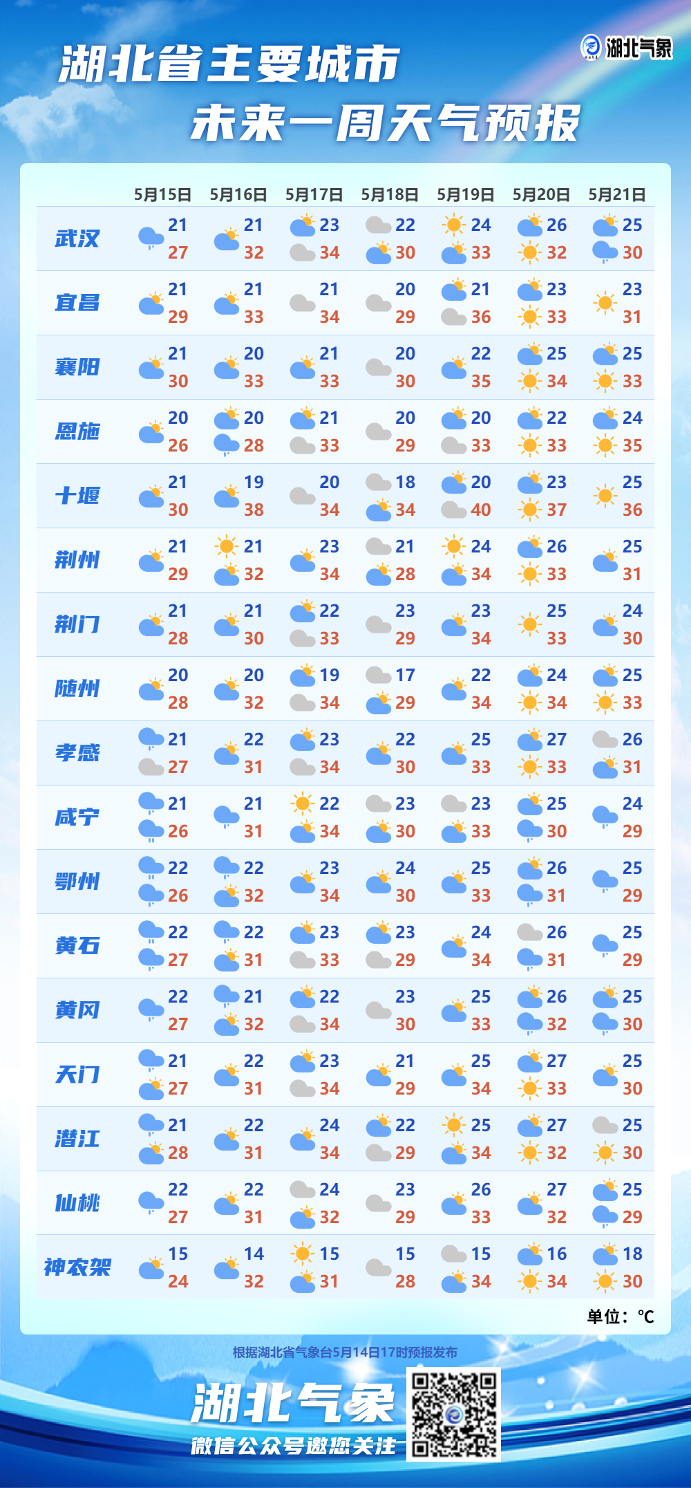 5月17日08时-18日08时,全省晴天到多云。最高气温恩施地区28~31℃、其他地区31~34℃,最低气温西部16~19℃、东部19~23℃,偏南风2到3级转偏北风3到4级、阵风5到6级。