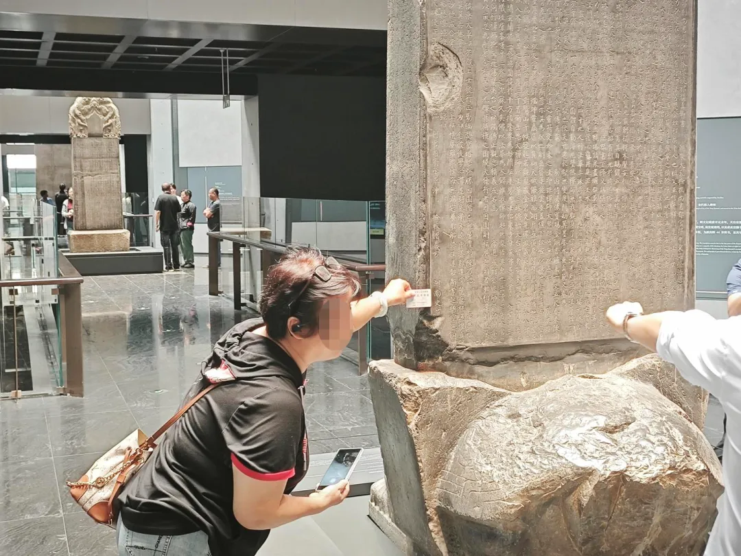 马先生说:“比如开成石经这种国宝,是全用玻璃罩上的。如果石碑不好整个保护,起码要保证人碰不到,得有物理围挡,不能像现在一样仅设置一条软性布条。可以将玻璃罩设置到胸口高度,让手不能伸进去。或者像山西博物院,采用电子围栏,游客靠近它就会发出警报。”
