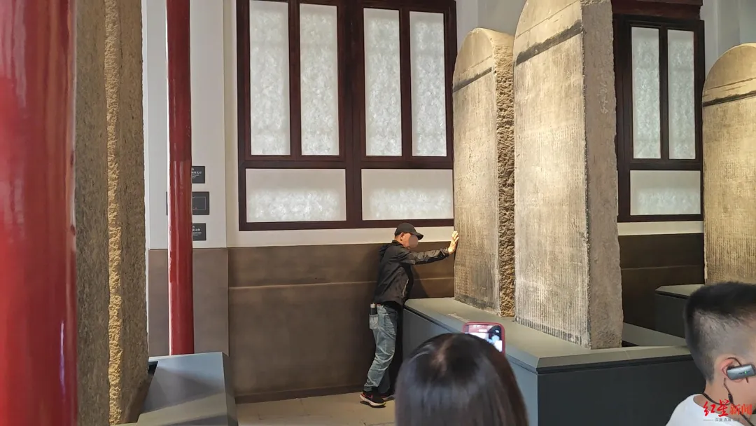 14日,红星新闻记者实地探访西安碑林博物馆,发现在老馆区的石碑前仍有部分游客尝试触摸碑身文字,但好在馆内空间不大,保安能及时发现并制止。