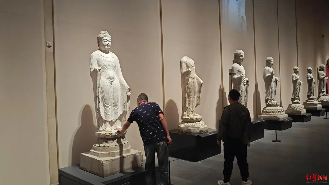 在新建的北区场馆内,一些石碑没有玻璃罩保护,但地上一层的安保人员充足,鲜有触摸事件发生,来往解说人员也会提醒游人。而佛教石刻雕像展厅内,记者亲眼看见一名游客刚进门后,就将手伸向佛像抚摸,现场保安未能及时发现。