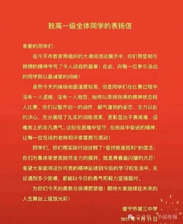 在今天市教育局组织的大课间活动展示中,你们用坚韧与拼搏的精神书写了令人动容的篇章!在此,向每一位参与活动的同学致以最诚挚的问候!